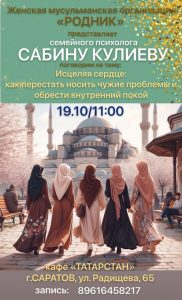 В воскресенье, 19 октября, в Саратове состоится встреча мусульманок «Исцеляя сердце: как перестать носить чужие проблемы и обрести внутренний покой», которую организует женская организация «Родник».