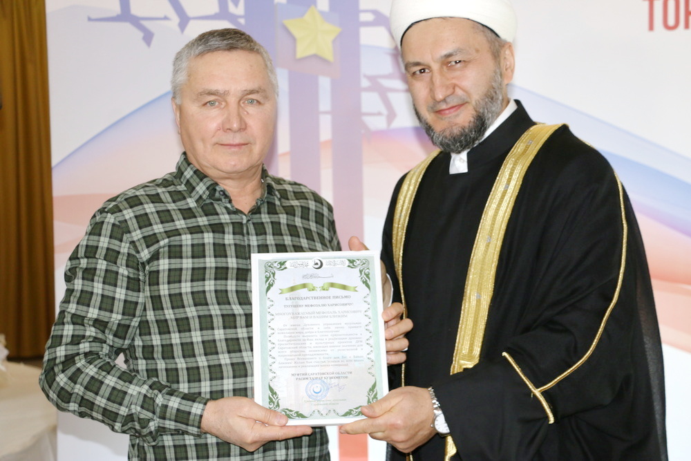 На этом чествования отличившихся представителей мусульманской общины не завершились. Первый заместитель главы ДУМСО Рушан-хазрат Сайфетдинов, имам Энгельса, преподаватель медресе «Шейх Саид» Махди-хазрат Алтынбаев, советники муфтия Рушан Жарков и Тарих Гатауллин, а также энгельсские активисты и меценаты Мефозаль Тугушев, Тагир Алимбеков, Ильдар Кадиров, Ринат Керимов, Ряшит Кудашев и Ринат Абушаев получили благодарности за содействие в проведении духовно-просветительских проектов ДУМ Саратовской области от муфтия региона Расима-хазрата Кузяхметова, который лично передал их участникам вечера.
