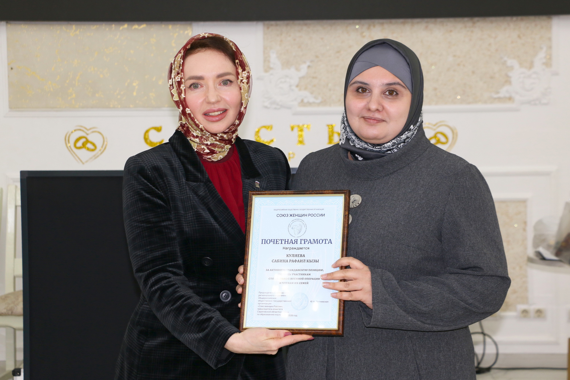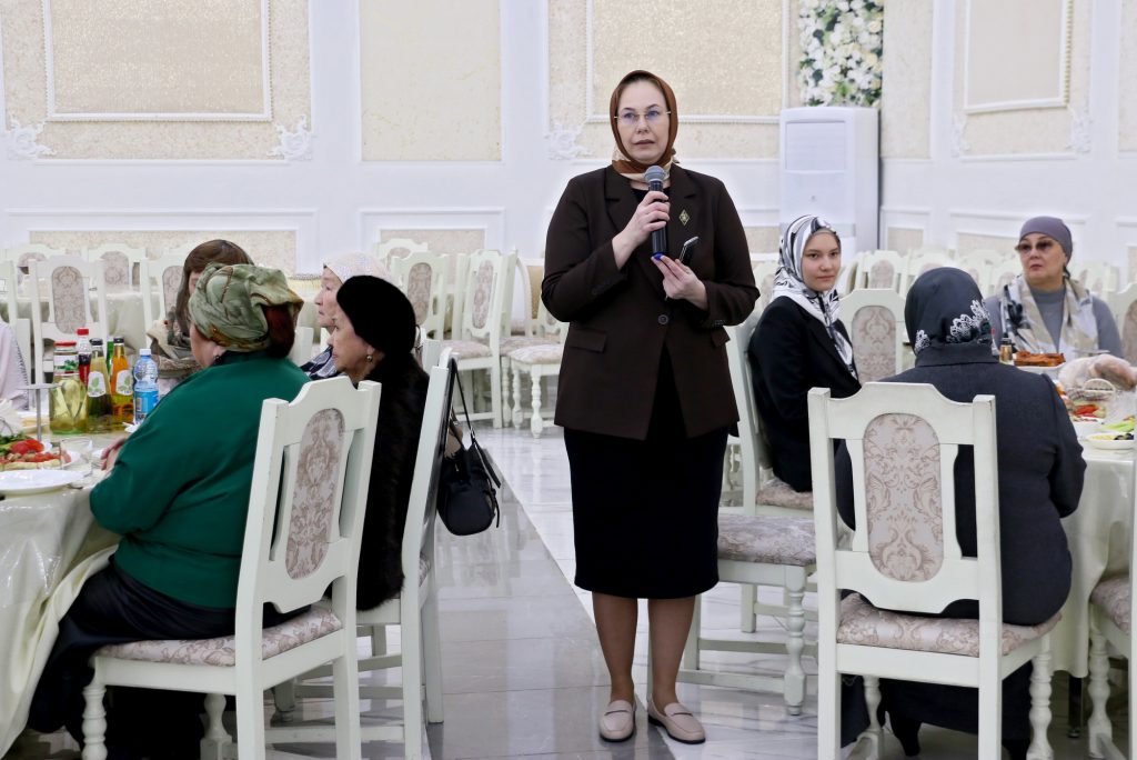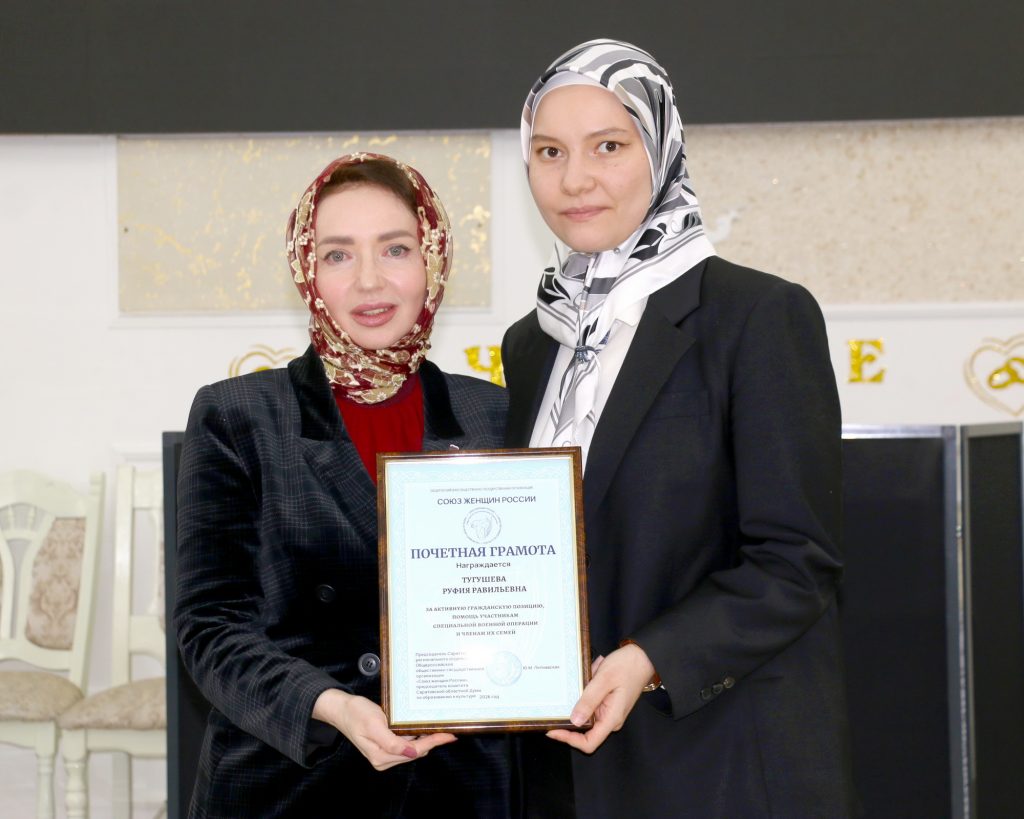 Юлия Литневская, депутат Саратовской областной думы, председатель Саратовского регионального отделения Общероссийской общественно-государственной организации «Союз женщин России», отметила, что сейчас одновременно проходит мусульманский и христианский пост. Она поблагодарила собравшихся за их труд и старания ради общего дела. Юлия Литневская также наградила почетными грамотами Руфию Тугушеву и Сабину Кулиеву, активисток женской организации «Родник», за активную гражданскую позицию, помощь участникам специальной операции и членам их семей.
