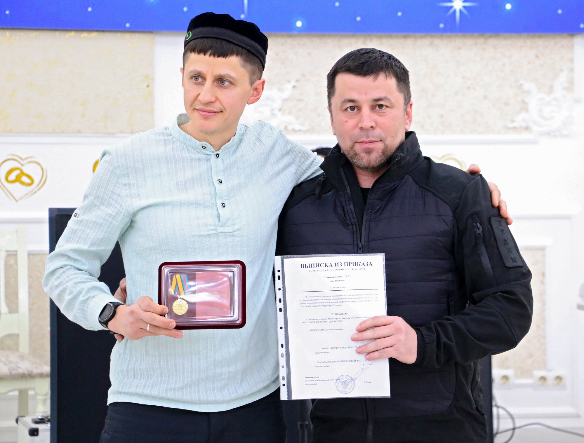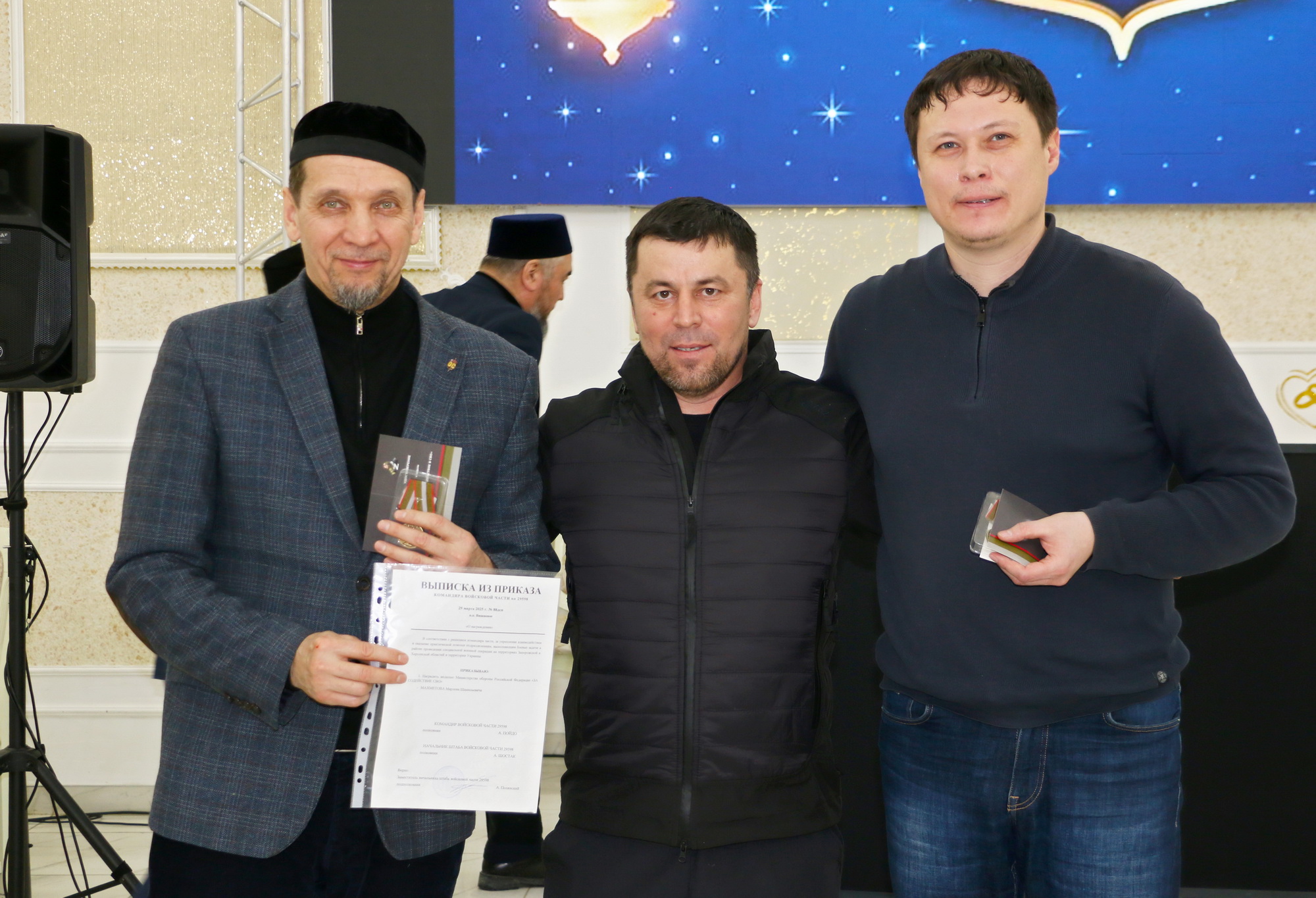В ходе ифтара рассказали о реализации проекта «Я не одна», были вручены подарки семьям участников СВО. Кроме этого состоялась церемония вручения медалей министерства обороны РФ. Руководитель волонтерской группы «Охотники 64» Залимхан Кошеров, который с начала специальной военной операции поддерживает бойцов на передовой и организует гуманитарную помощь, от лица одной из воинских частей вручил медали министерства обороны РФ «За содействие СВО» заместителю главы ДУМ Поволжья Ахмеду-хаджи Махметову и Дамиру Мазунову, медаль министерства обороны РФ «За укрепление боевого содружества» вручили Ильнару Мавлютову. Они получили награды за «укрепление взаимодействия и оказание практической помощи подразделениям, выполняющим боевые задачи в районе проведения СВО на территориях Запорожской и Херсонской областей и территории Украины».