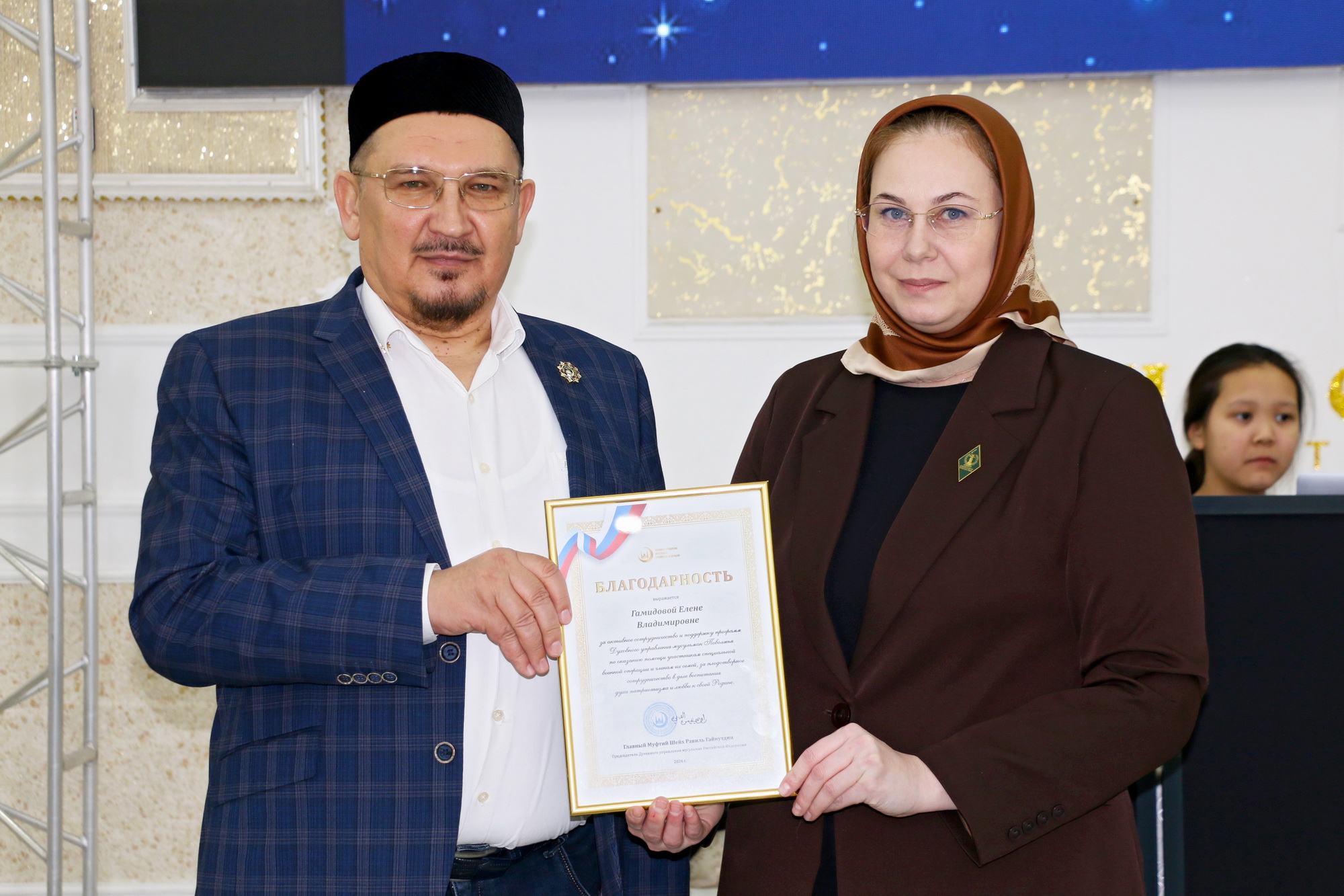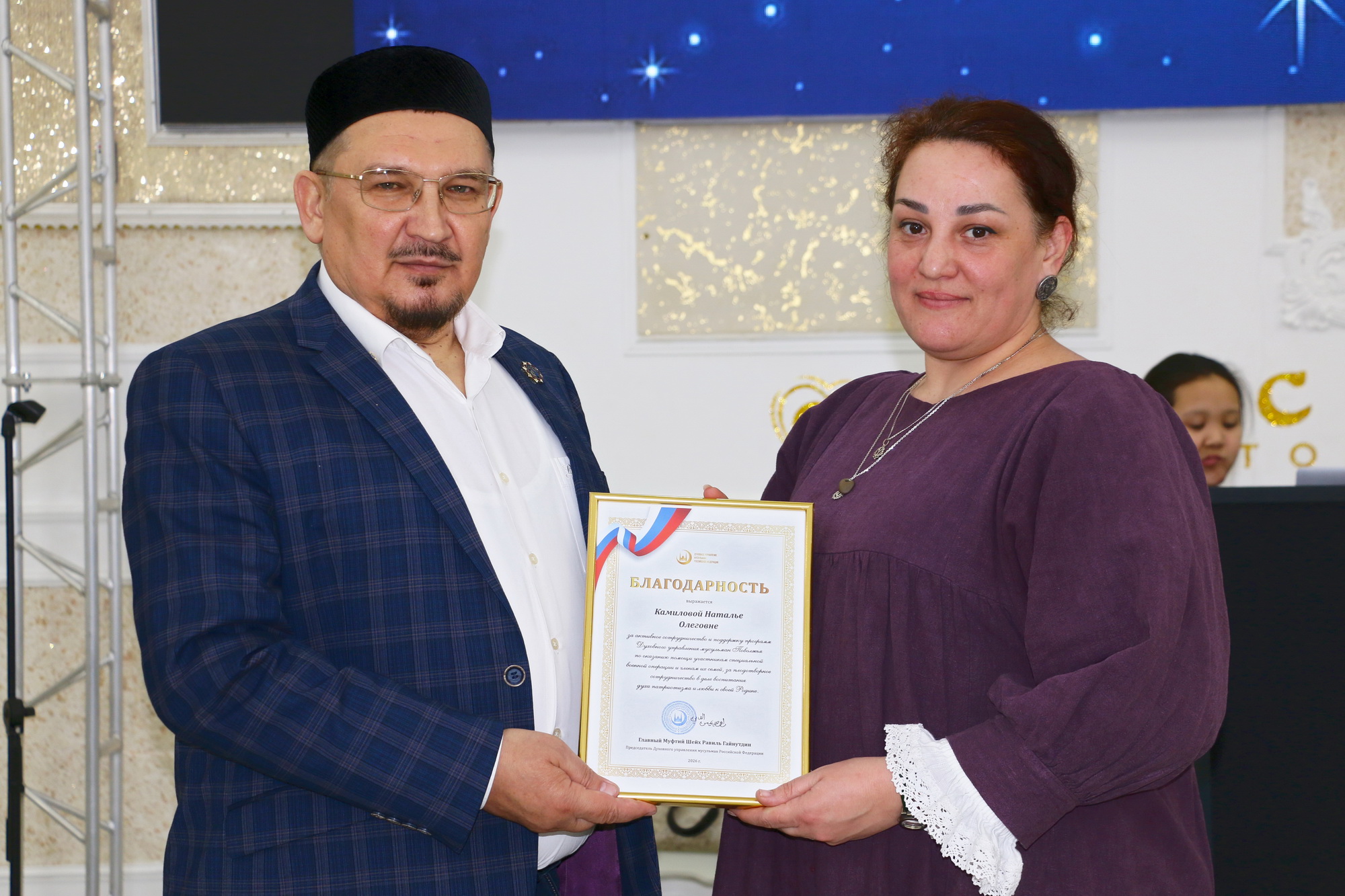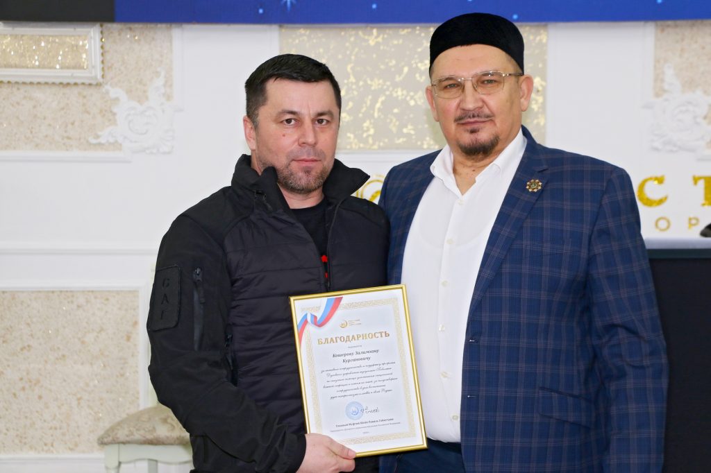 В завершении вечера заместитель главы ДУМ Поволжья, имам-хатыб Саратовской Соборной мечети Рустам-хазрат Мухитов поблагодарил всех за поддержку. От имени председателя ДУМ РФ, главного муфтия шейха Равиля-Гайнутдина были вручены благодарности Залимхану Кошерову, Елене Гамидовой и Наталье Камиловой за активное сотрудничество и поддержку программ Духовного управления мусульман Поволжья по оказанию помощи участникам специальной военной операции и членам их семей, за плодотворное сотрудничество в деле воспитания духа патриотизма и любви к своей Родине.