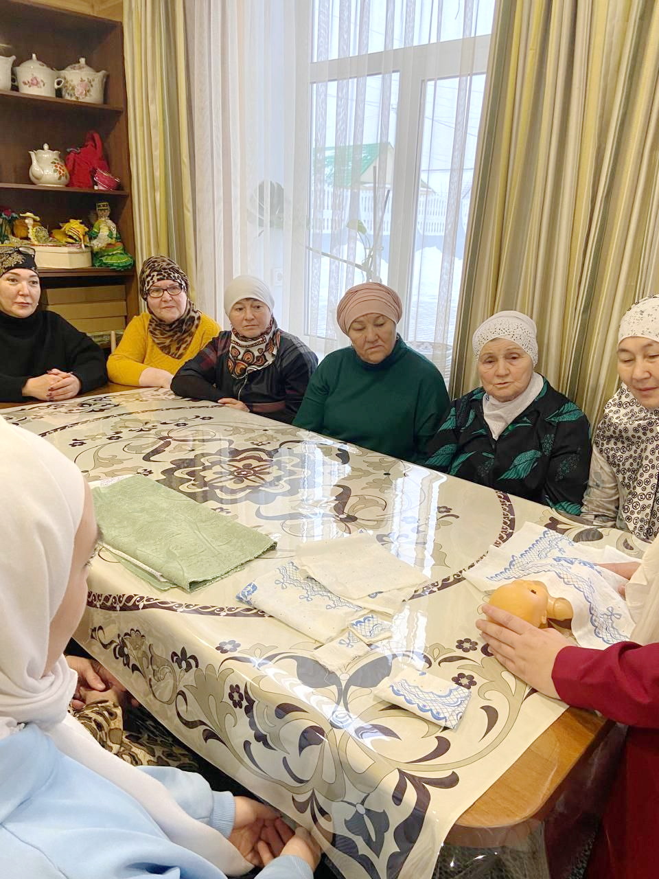 Встреча с практической часть была организована по просьбе сестер и на другую, тоже крайне важную тему: «Проводы покойной. Обмывание. Заворачивание в саван». В ходе нее верующие не только получили полезные знания, но и смогли попрактиковаться на специальном полотне.