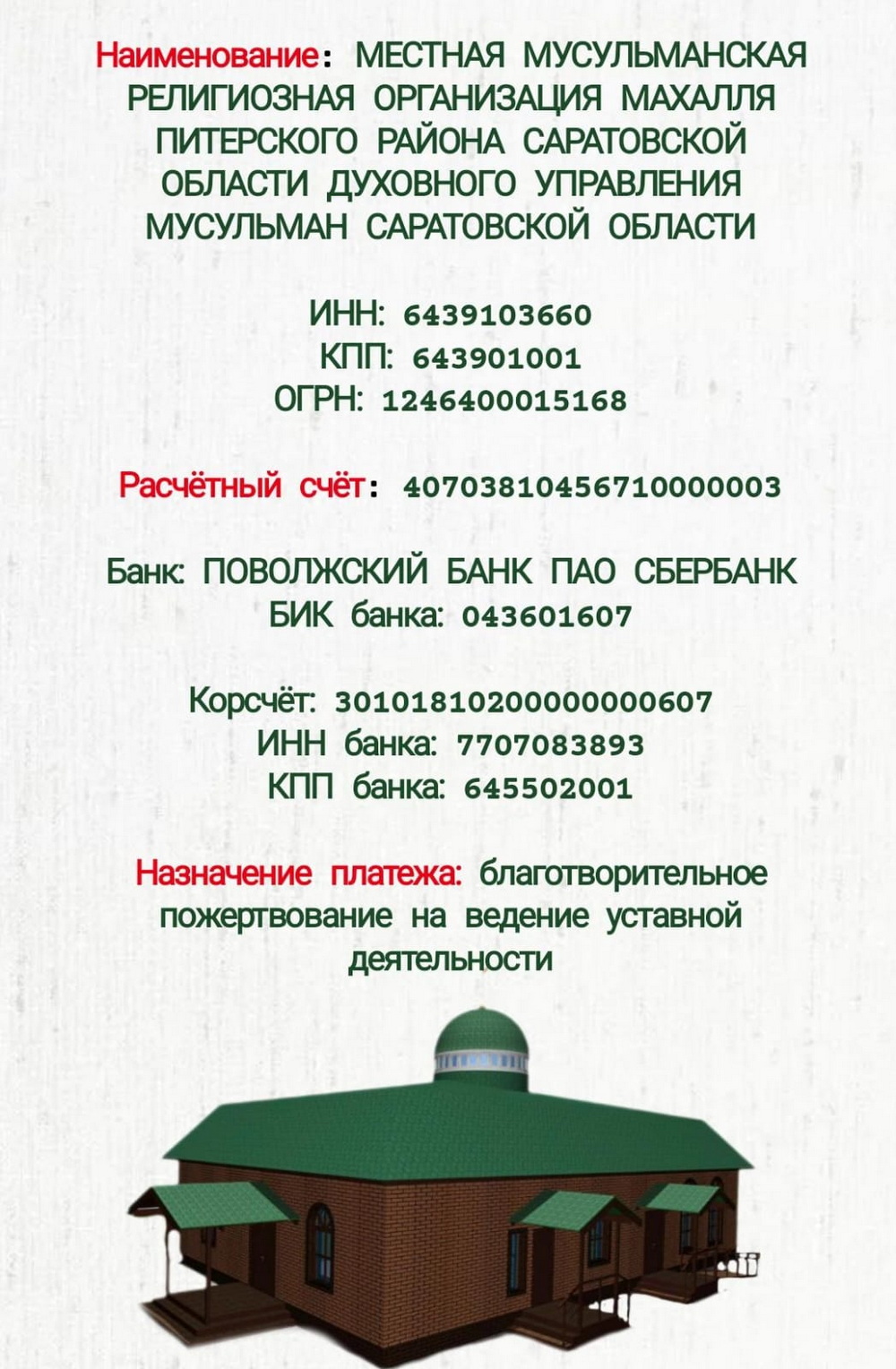 Для продолжения строительства и обустройства территории необходимы финансовые средства. Если вы хотели бы сделать пожертвование (садака), его можно перевести на расчетный счет махалли (местной религиозной организации): 40703810456710000003. Подробнее реквизиты смотрите на прикрепленном фото.