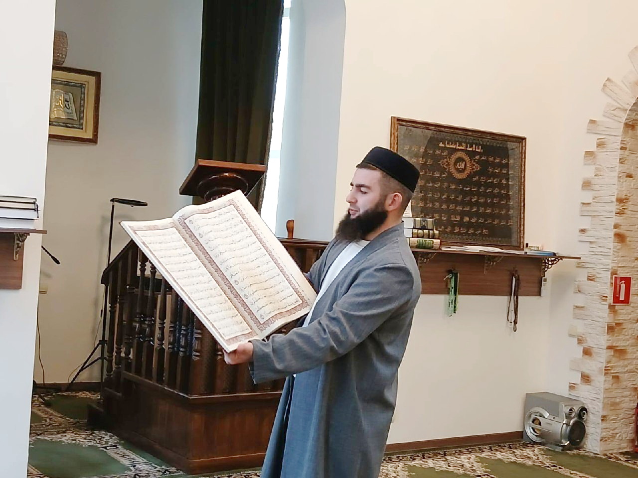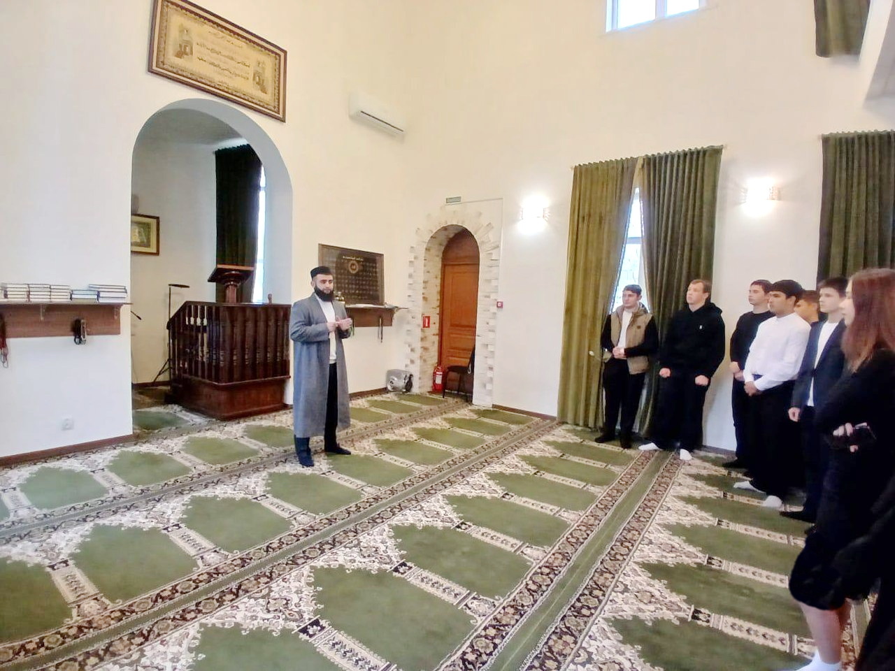 Экскурсию по мечети для юных посетителей провел имам Ершова Мухаммад-хазрат Хутиев, а также рассказал школьникам об основах Ислама, важности намаза в жизни каждого верующего и отличиях мусульманского храма от других сооружений, показал в развернутом виде Священный Коран.