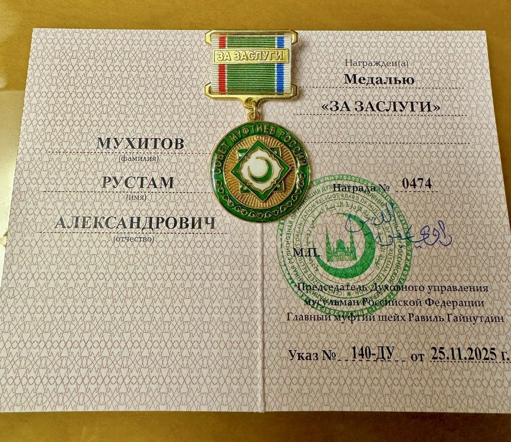 Ранее медаль «За заслуги» из рук шейха Равиля-хазрата Гайнутдина на прошедшем 18 октября 2025 года торжественном закрытии XXIII Московского международного конкурса чтецов Корана получил и руководитель центра «Зейд бин Сабит» Ильяс-хазрат Ильясов.