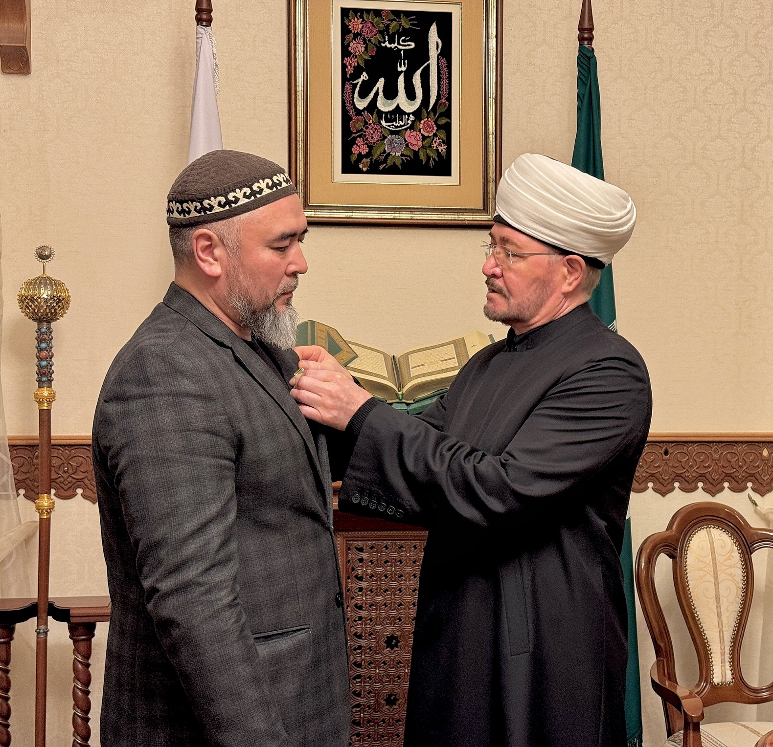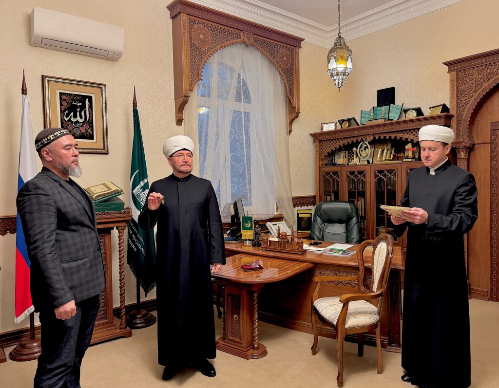 Это произошло 25 ноября 2025 года в резиденции ДУМ РФ в ходе встречи духовного лидера мусульман России с делегацией ДУМ Поволжья во главе с муфтием Мукаддасом-хазратом Бибарсовым. Во встрече также принимали участие первый заместитель председателя ДУМ РФ, муфтий Дамир-хазрат Мухетдинов, руководитель Департамента по внутренней политике ДУМ РФ Наиль-хазрат Шакиров, руководитель коранического центра «Зейд бин Сабит» Ильяс-хазрат Ильясов и др.