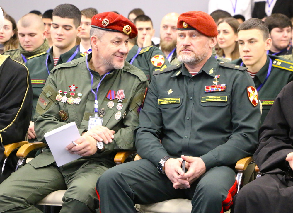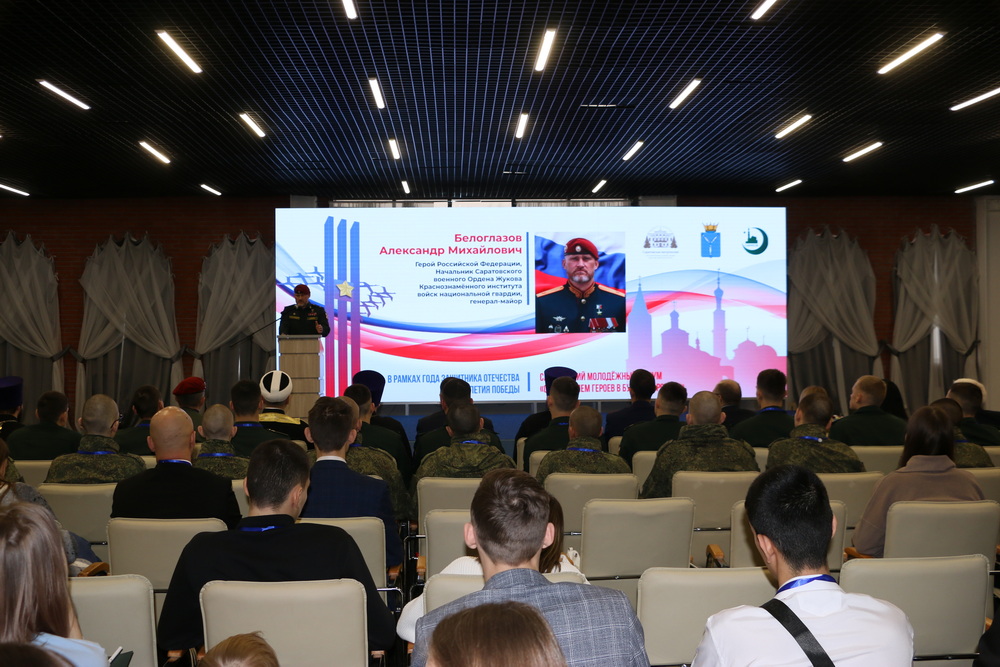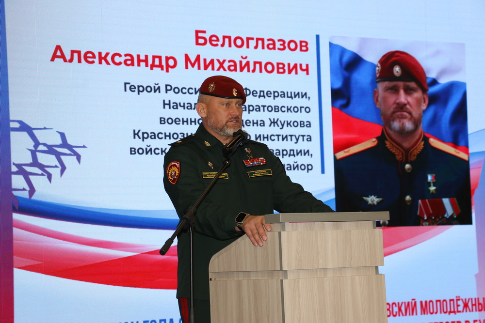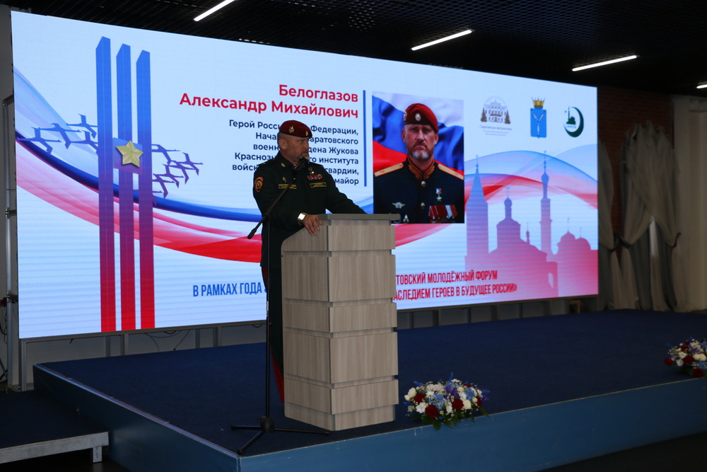 Герой России, начальник Саратовского военного ордена Жукова Краснознаменного института войск национальной гвардии Российской Федерации, генерал-майор Александр Белоглазов отметил, что Россия – это мировой феномен. Огромная площадь, несметные полезные ископаемые, 11 часовых поясов, многонациональный и многоконфессиональный народ с богатой историей. По словам спикера, враги России различными инструментами делают все, чтобы ослабить нашу страну, всячески влияя на детей и подростков. «Воспитание подрастающего поколения очень важно для меня. Дети – наше будущее. Они будут завтра принимать решения, будут определять внутреннюю и внешнюю политику, будут обеспечивать национальную безопасность нашего государства. Сила России внутри нас, в нашей истории, культуре, традициях и единстве наших народов», — подчеркнул Герой России, генерал-майор Александр Белоглазов.
